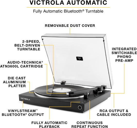 Victrola Fully Automatic Bluetooth Turntable w Audio Technica ATN3600L Cartridge, Automatic Repeat Function, 2-Speed Vinyl Record Player, Wireless Bluetooth Streaming, Preamp & Aluminum Platter White